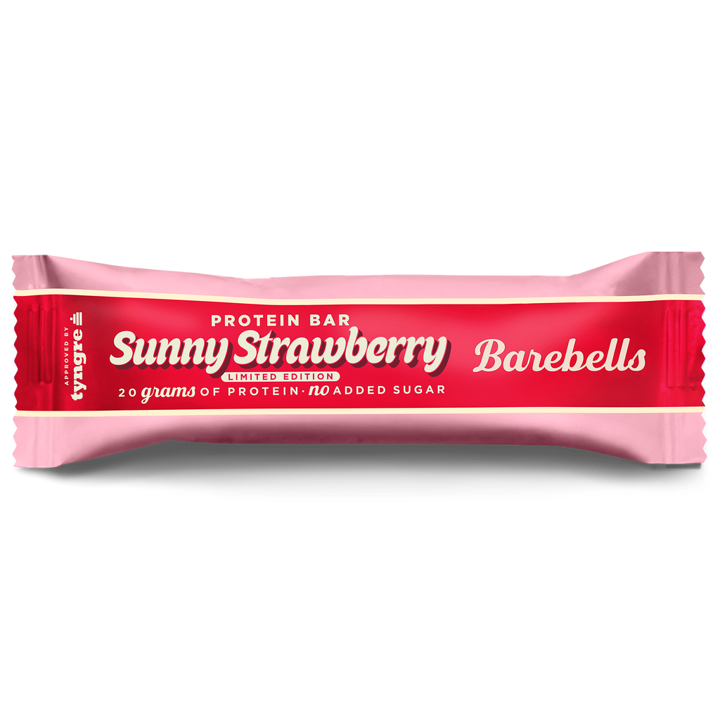 Barebells Protein Bar Sunny Strawberry är en Limited Edition proteinbar med överdrag av vit choklad (23 %) och en smak av jordgubb och citron. Innehåller sötningsmedel och naturligt förekommande socker.