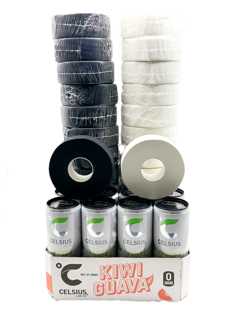 Package 20 x Hockey tape + Optional 24 Pack. Choose the color of the hockey tape and the flavor of your 24 pack. Choose between Nocco, Celsius, Red Bull and Latitude.