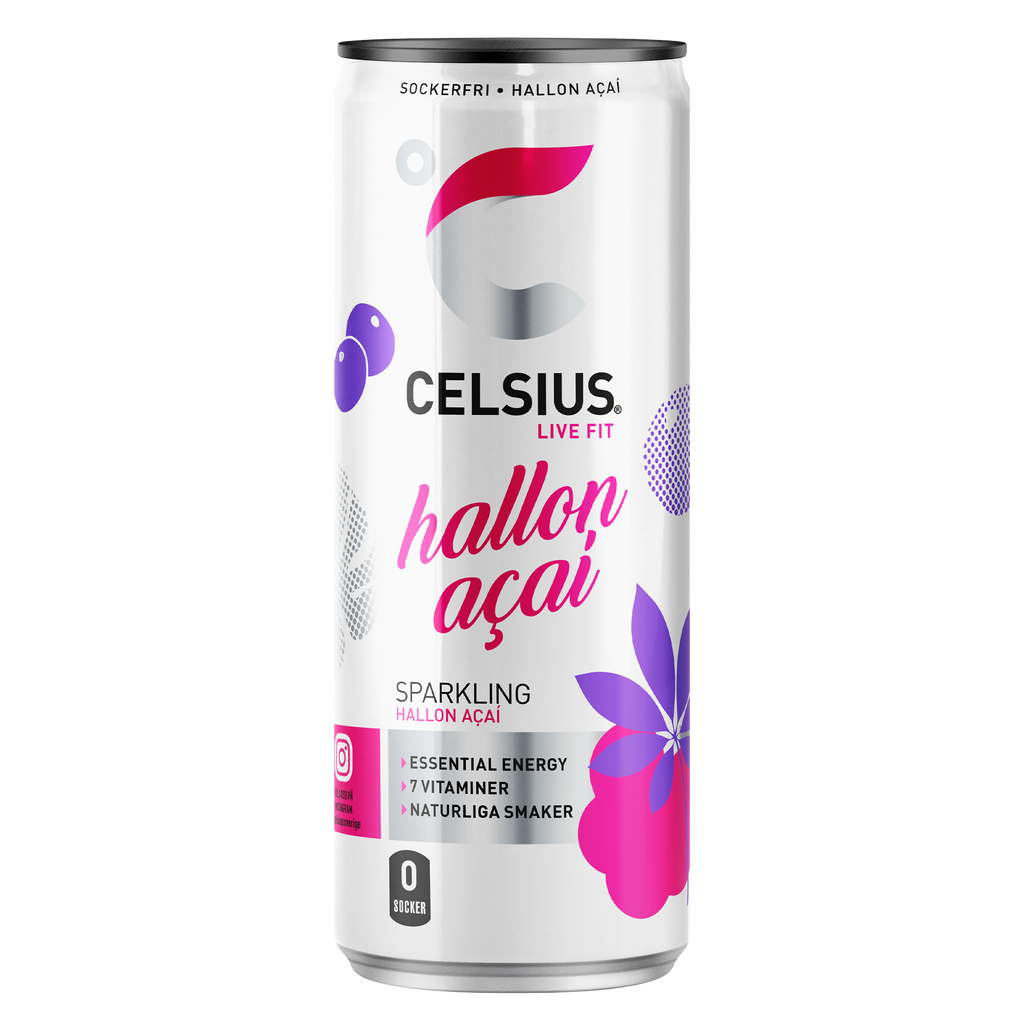 Celsius Hallon Acai ger dig en energikick med sin unika blandning av vitaminer, ingefära och koffein.
