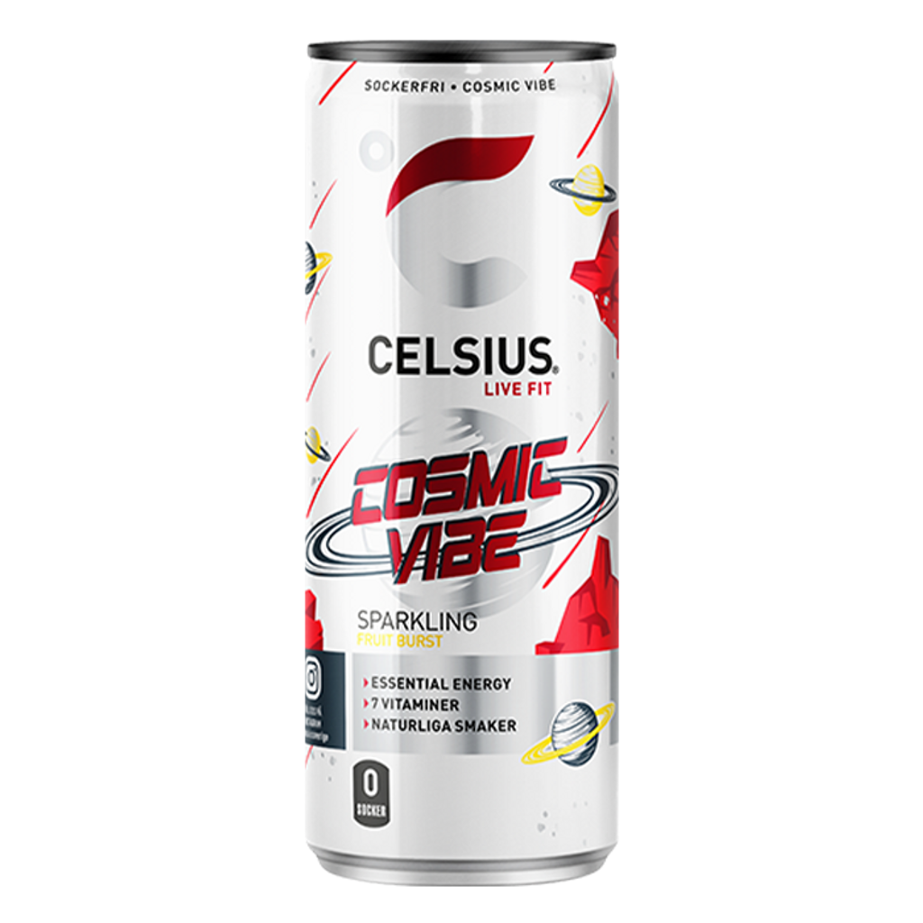 Celsius är en välsmakande, läskande och uppfriskande energidryck som är rik på vitaminer.Perfekt när du tränar medan du njuter av den söta smaken av läckra Cosmic Vibe!